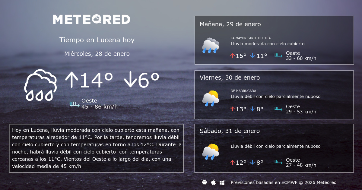 Información sobre uso de cookies. El tiempo en Lucena Córdoba por horas. Te ofrecemos la previsión meteorológica en 200000 ciudades mapas del tiempo información sobre estaciones de esquí playas y mucho más.